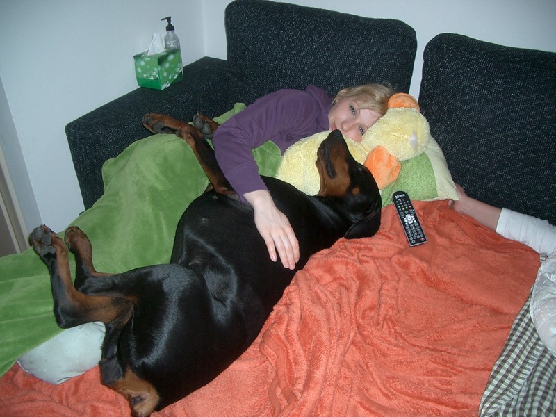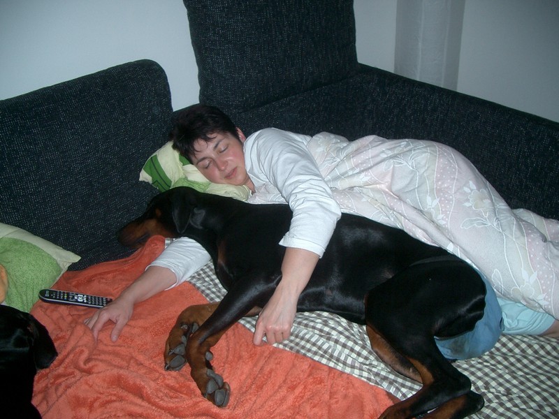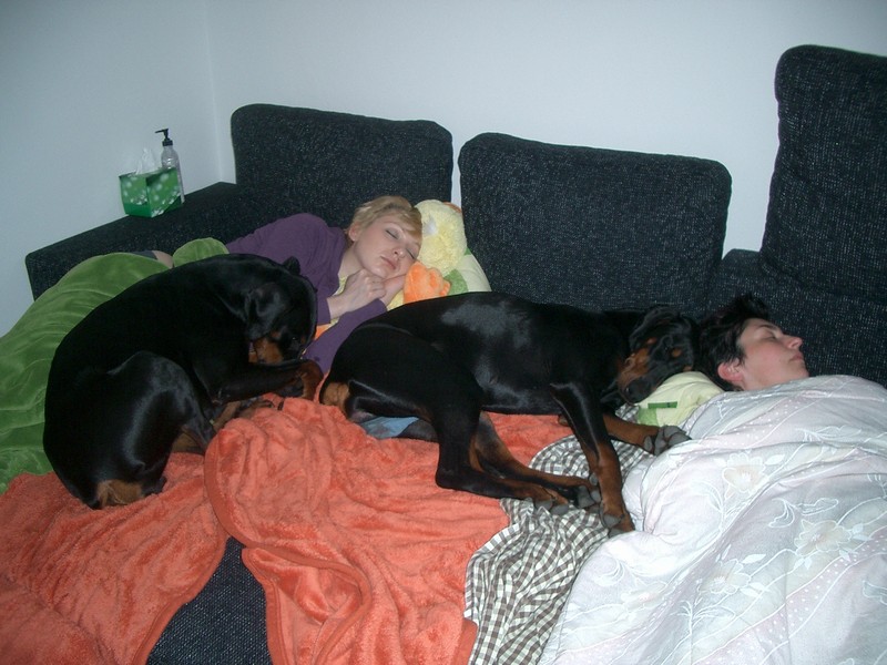 Dobrman potřebuje nejen pravidelně pracovat, ale i odpočívat. My umíme odpočívat jak se patří. A protože Hermína zrovna hárá, spíme raději na dekách, které jdou snadno vyprat. Hárací kalhotky jsou sice jistota, ale né vždy jistota stoprocentní.