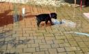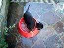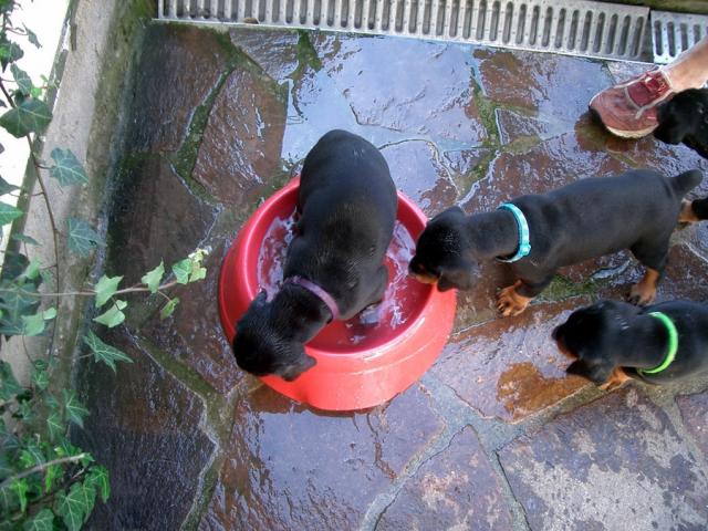 V těchto dnech doslova padáme horkem na "hubu". My i našich 10 dobrmanů. A protože naše mimina ještě neznají vodu, dneska jsme je naučili, že voda je sice mokrá a studená, ale vůbec se jí nemusí bát a taky se jí nebojí. Po odpolední svačince jsem jim čumáčky, záda a packy od mlíčka umyla ve venkovní míse na vodu. Právě proto, že tato miska je velikostně pro bernardýna, vešel se tam každý bez probémů.