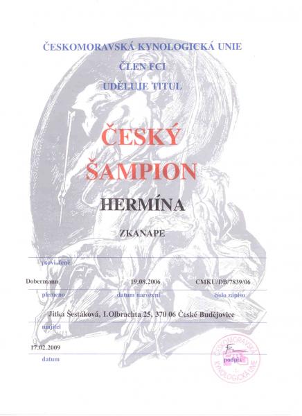 Výborná NVP Mladá Boleslav 2007 V3 MVP Brno 2007 V1 Vt.OV Benátky nad Jizerou 2007 V4 MVP Brno 2008 V1 Vt. OVP Hořovice 2008 V1 CAC MVP České Budějovice 2008 V2 res.CAC KV MSDK Kroměříž 2008 V2 res.CAC MVP Brno 2008 V1 CAC MVP Ml.Boleslav 2008 V2 res.CAC Klubová výstava DKČR Sadská 2008 V2 res.CAC MVP České Budějovice 2008 V1 CAC Duo Cacib Brno 02/2009 V1 CAC res.CACIB Duo Cacib Brno 02/2009 V1 CAC MVP Praha Letňany 05/2009 V1 CAC Klubová výstava v Sadské 09/2009 V2 res.CAC NV Mladá Boleslav 07/2010 V1 CAC, CACIB MVP Č.Budějovice 10/2010 Hermíně byl udělen titul Šampion krásy ČR a Klubový šampion DKČR |