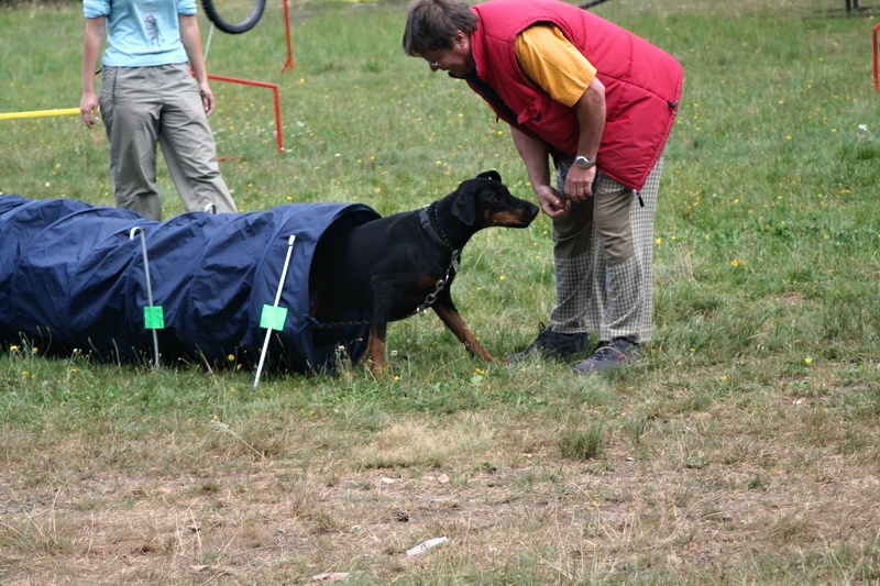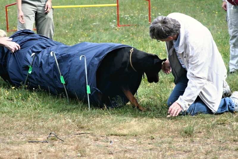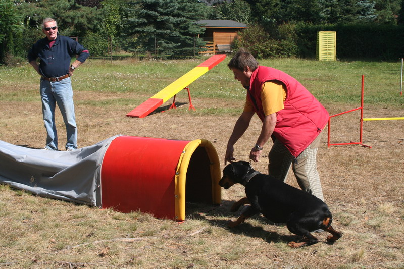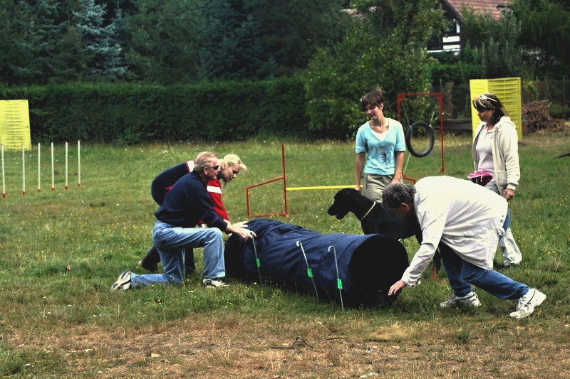 Odpoledne po obědě se pro zábavu zkoušeli agility. Nevím jestli to víc bavilo lidi nebo dobrmánky, ale podle fotek bych řekla, že obě strany se z každého zdolaného tunelu moc radovaly. My se této legrace nezúčastnili. Štěnata "padla za vlast" a holky dostaly odpočinkovou přestávku.