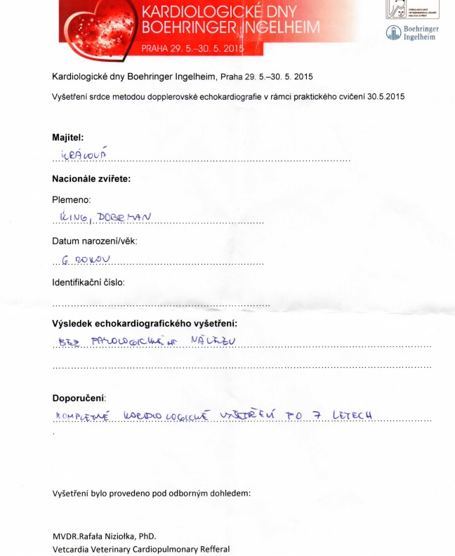 Odborným garantem semináře byl vynikající polský kardilog MVDr.Rafal Niziolek,Ph.D. žák Prof. Ch. Lombarda, člen International Veterinary Emergency and Critical Care Medicine (IVECCS), který osobně Kingovi vyšetřil srdce s výsledkem - zdravé srdce beze změn a bez známek kardiomyopatie (SONO, COLOR DOPPLER)