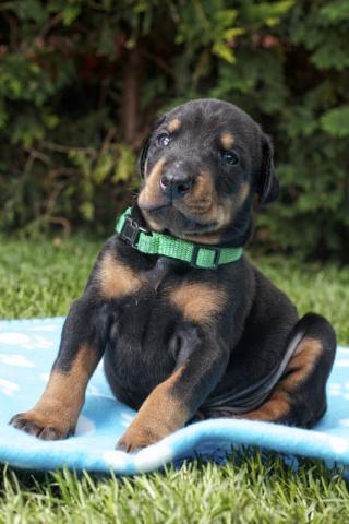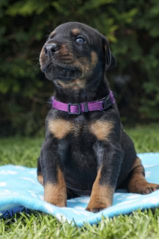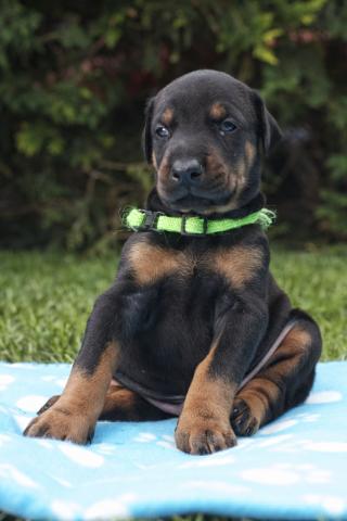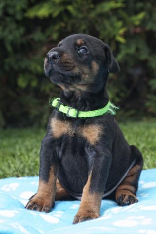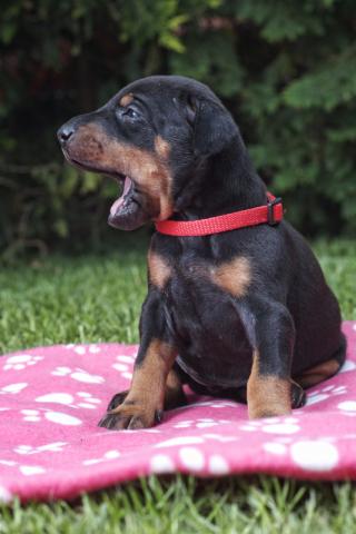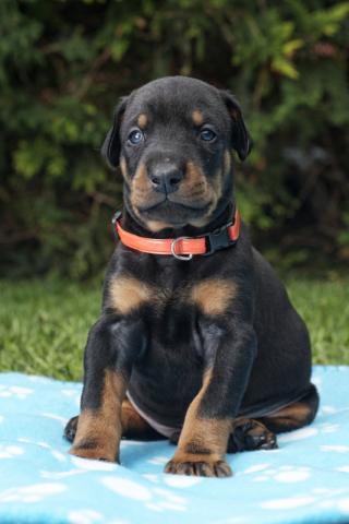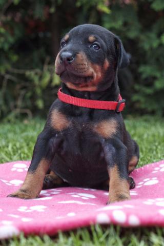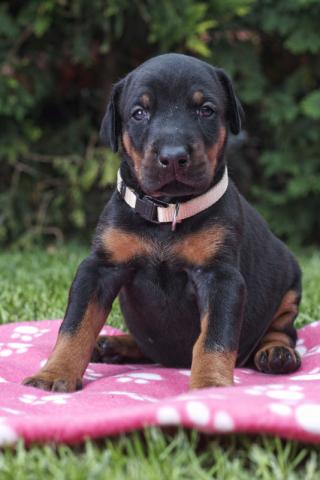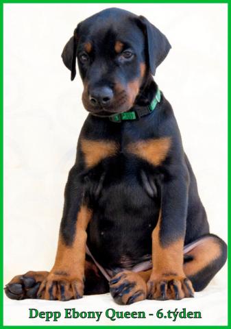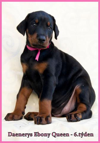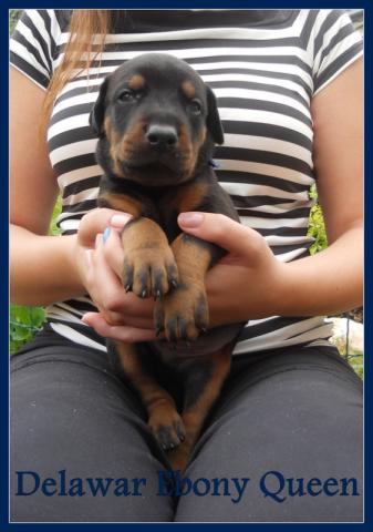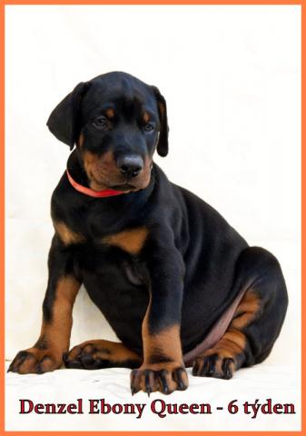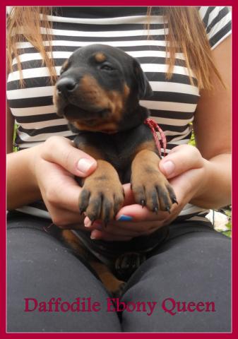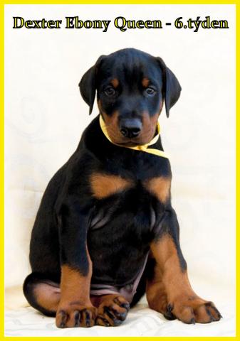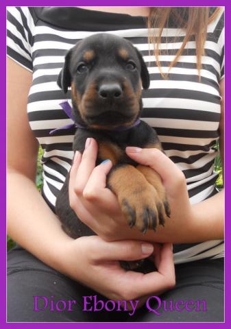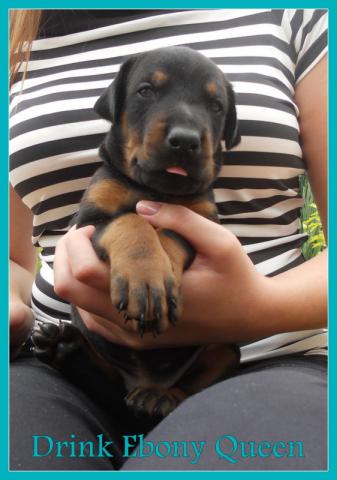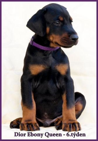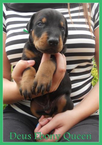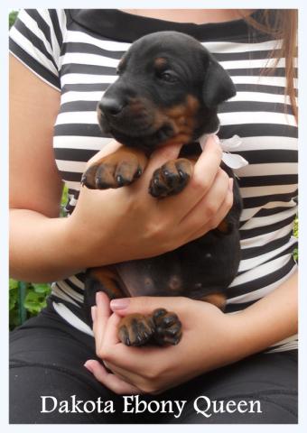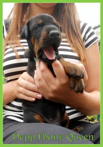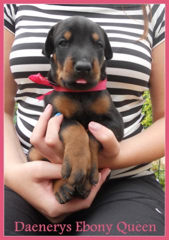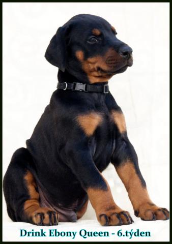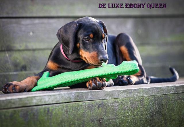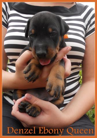 APACHE RED EBONY QUEEN je klidný, vyrovnaný a sebevědomý pes s velkou chutí pracovat. Je vášnivý aportér a výborný obranář, ale na druhé straně je výborně socializovaný. Jeho otcem je finský pes Cliff vom Beuchower Hof- účastník Mistrovství světa IDC dobrmanů v roce 2009.