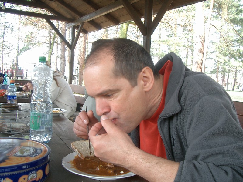 Odpolední skupina přijela na druhou hodinu, to mi už měli odkousáno. Sledovali jsme z pod pergoly odpolední skupinu a obědvali. Stůl nabízel k obědu opravdu hojnost různých lahůdek, že jsem se na chvíli nemohla zbavit dojmu, jestli jsme nepřijeli na nějakou hostinu. Našli byste zde štrůdl,borůvkový koláč,ovocné zákusky, meruňkovou buchtu,pizzu,chlebíčky,uzené,okurky,guláš,kari rýže s kuřecím,bramboračku, nechybělo ani kafe,pivo jak alko i nealko.Guláš chutnal skvěle