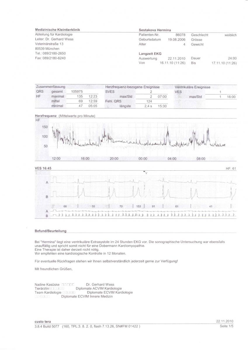 RTG 0/0 (ČR - MVDr. Ekr.) RTG HD - A (Německo) 16.11.2010 Kardiologické vyšetření – Mnichov - 24h-Holter, Doppler, Echocardiografie, Sono, 15 min. EKG negativní |