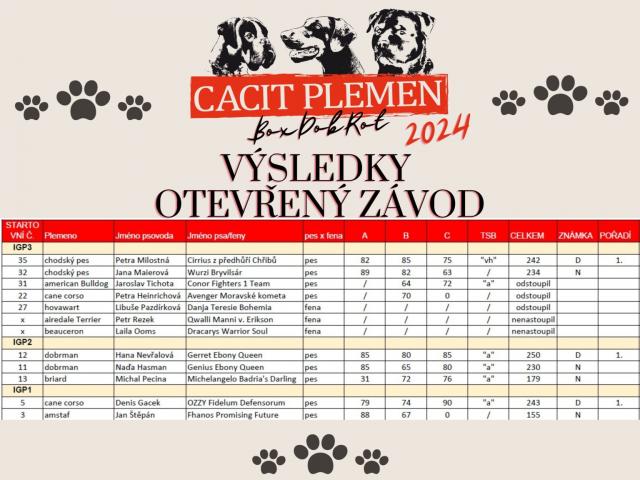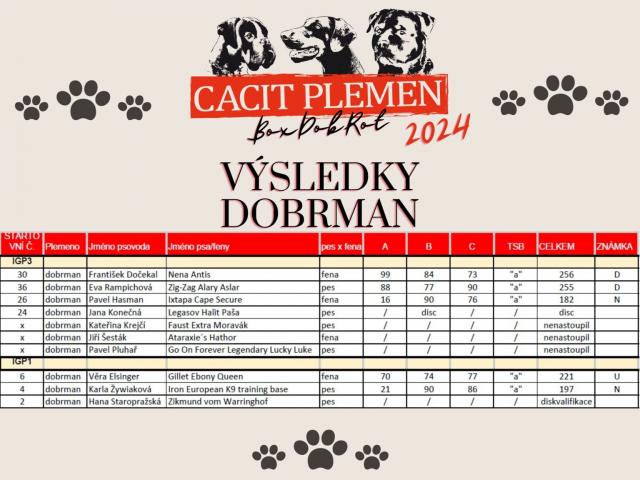Tento víkend se konal závod CACIT všech plemen 2024 ve Všestarech, který zároveň sloužil jako mistrovství republiky dobrmanů 2024. Počasí bylo, jak se říká, katastrofální. Česká republika čelila obrovským povodním, místy se objevila i stoletá voda. Ve Všestarech sice žádné povodně nebyly, ale od čtvrtka pršelo a déšť doprovázel silný vítr. I přes tuto nepřízeň počasí se na závod vydali tři psi z naší chovatelské stanice z vrhu G Ebony Queen - Gillet, Genius a Gerret.