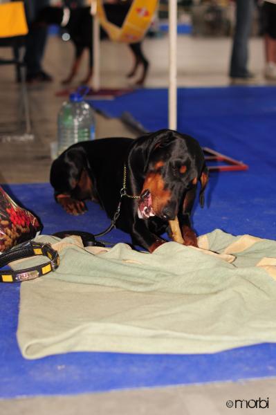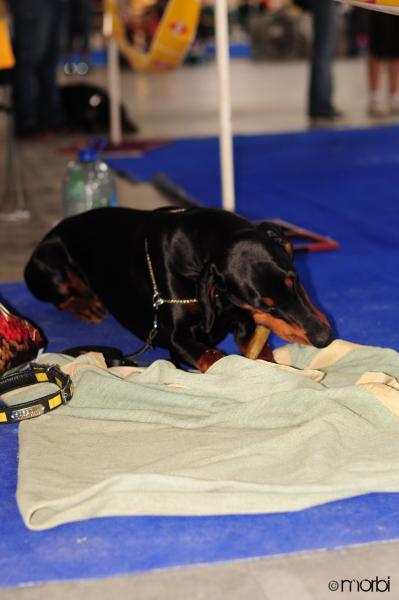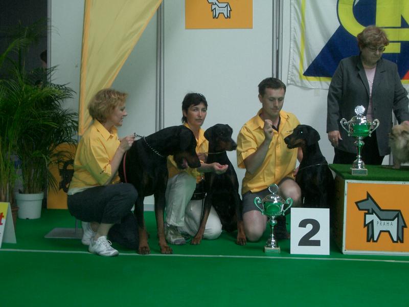 V Praze na výstavišti jsme ještě nebyli, takže to byla tak trochu naše premiéra. V kruhu jsme sice už jako doma, ale těch spoustu na sebe navazujících pavilónů mi dělalo problém se orientovat. Dobrmánků se přihlásilo málo. My jsme byli přihlášeni v pracovní třídě společně s Efritou Brynal Gold (Tabor v.Castell x Bora Belníčko). Možná se to někomu bude zdát divné, ale já byla ráda, že jsme se v kruhu setkali zrovna s touto fenkou. Poprvé jsme totiž spolu soupeřili na klubovce 6.9.08 v Sadské, kde nás Efrita porazila a na nás zbylo druhé místo. V Praze už jsme si vítězství nenechali utéct. Možná, že to bylo díky běhu, který jsme za tu dobu hodně zlepšili díky tréninku s Klánovickejma holkama, nebo jsme na rozhodčí zapůsobili jako sehraná dvojka. Fotky z kruhu bohužel nemám. Za prvé jsem vůbec nestíhala fotit a pak ten můj fotáček by si asi těžko poradil s tím šerem v hale. Naštěstí fotila Lucie Skopalová.